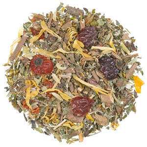 Zutaten: Baldrianwurzel, Passionsblumenkraut, Melissenblätter, Pfefferminzblätter, Fenchel, Kümmel, Anis, Hagebuttenschalen, Rosmarinblätter, Ringelblumenblüten